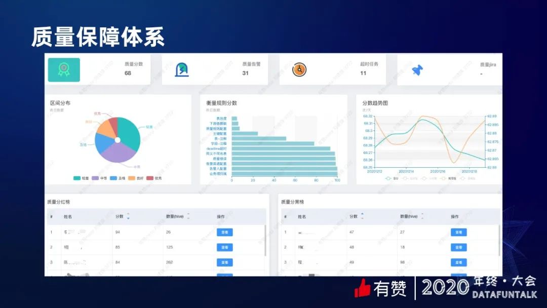 上图是我们的质量大盘,最上边会有几大模块,一个是质量分数,然后是只要告警,还有超时任务,每个模块里面都会有具体的一些细节展现。