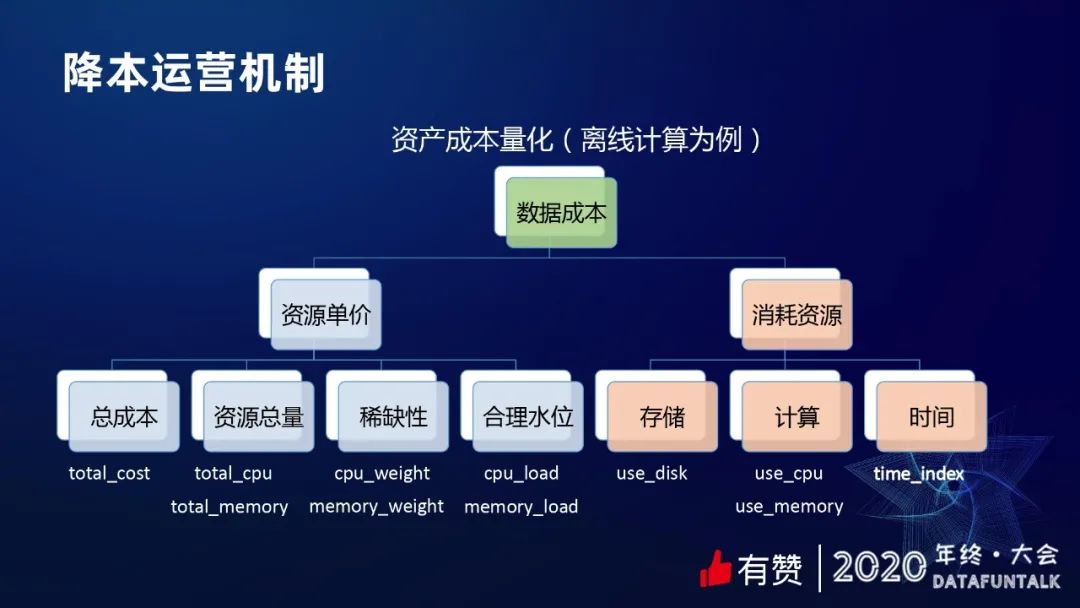 第二是降本,给大家看到成本之后,希望说大家做一些降本的工作,减少浪费。所以我们也做了很多降本的挖掘,包括怎么挖出哪些数据可以下线、哪些数据可以做延迟启动。延迟就跟上面我们讲的运行时间段有关,比如不重要的任务,不一定要在凌晨的时候跟那些高优先级的任务抢占资源,可以把它挪到白天的时候执行,这样我们在算成本的时候会给一些折扣,这也算是降本的一种方式。还有很多任务,可能是小时级、甚至分钟级调度的,小时调度的任务,一天跑 24次,它成本就是每天调度任务的24倍。实际有没有必要?未必,通过我们的调研发现存在很多这样的人物,是可以做调度周期的优化。此外,还有一些调优的具体手段,怎么去避免数据倾斜,怎么去减少数据量的使用等等。
