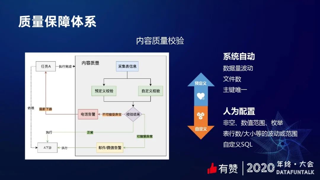 质量校验包括两个方面,预定义校验和自定义校验。预定义校验,我们系统自动执行的,不需要人工做任何的配置,包括数据量的波动、文件还有组件唯一性的校验等等。自定义校验需要每个数据owner做一些配置,在我们系统上也支持了很多,比如说非空校验、数值范围校验、还支持自定义SQL校验。