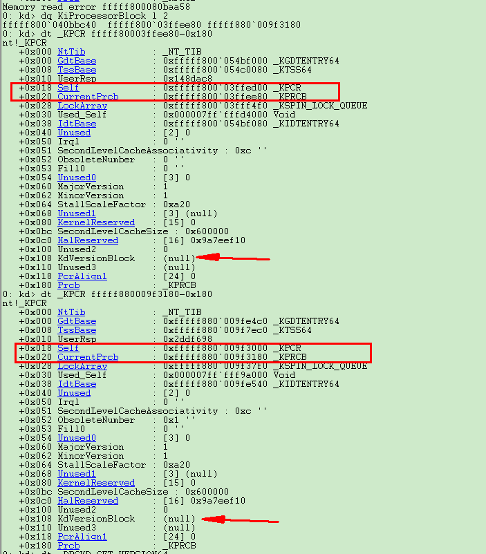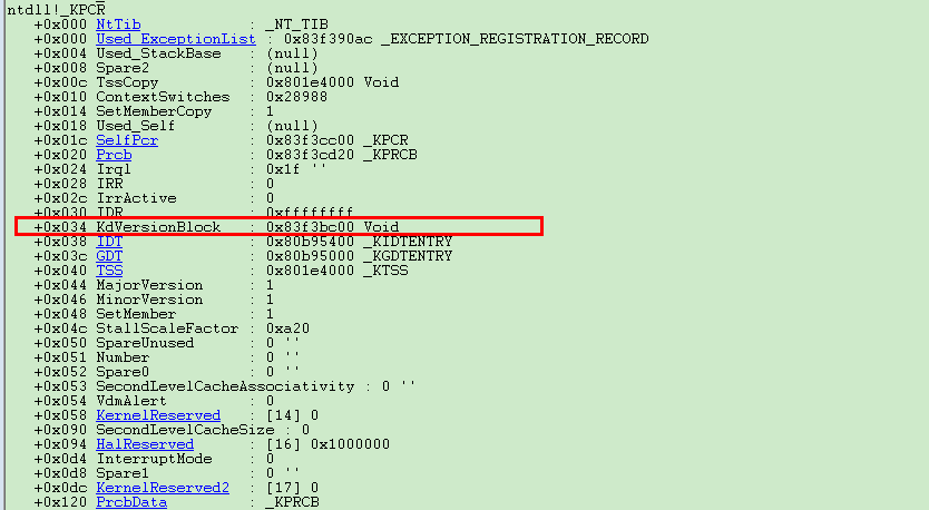 KdVersionBlock在KPCR中位置如图所示,这里需要注意,对于多处理器的环境下,如果想正确获取KdVersionBlock的值,必须保证当前的线程运行在1号处理器上。