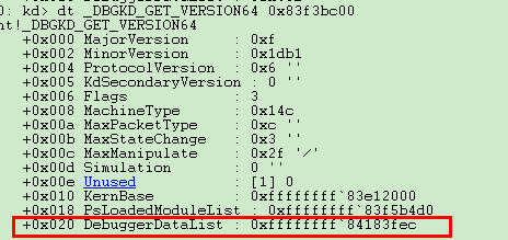 然后查看KdVersionBlock结构,最下面的便是KdDebuggerData64结构。