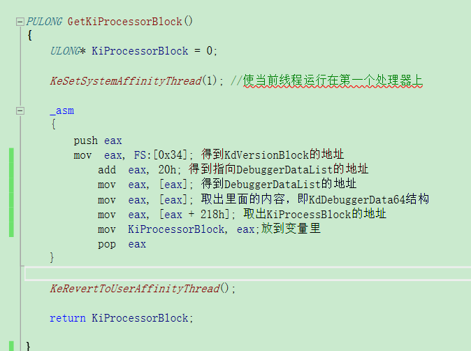 而KiProcessorBlock在KdDebuggerData64这个结构中,KdDebuggerData64可以从KdVersionBlock中得到。方法如下: