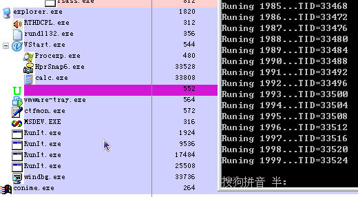 虽然ProcessId和ThreadId同样在PspCidTable占位,但是创建线程的开销明显要小于创建进程,因此这里创建2000个线程,而且 这个线程里等待一个无信号的事件而进入挂起状态,运行开销也要小得多。(当然也可以直接在创建时就挂起)运行这个程序,可以直接从返回的ThreadId 明显感觉到PspCidTable的膨胀。在我把这个程序运行了四次之后,就可以看到pid=25508=0x63A4(此时其线程的tid更大),再运 行Windbg可看到其pid=33736=0x83C8,很BT~