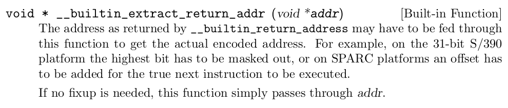 第9行,__builtin_extract_return_addr((void *)addr)返回实际的addr,这里返回的还是addr,这个函数的说明可以参考GCC文档: