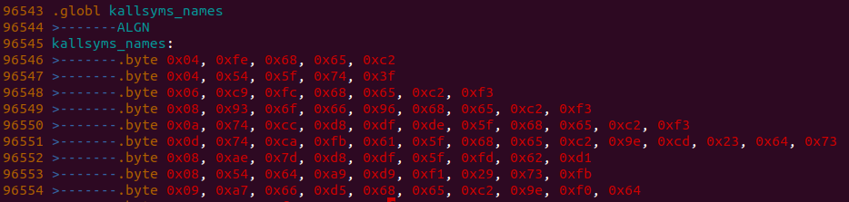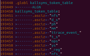 kallsyms_names中存放的是每个符号的名字,每一行对应一个,不过这里为了压缩字符串,第一列表示后面的字节数,第二列开始表示的都是索引,索引的是kallsyms_token_index数组中的元素,而