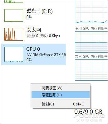 " 性能 " 标签左侧右击然后选择 " 隐藏图形 ",接下来双击左侧栏,就能够将任务管理器缩小为一个面板,这时面板中只会显示 "CPU 占用 "、" 内存占用 "、" 磁盘占用 "、" 网络占用 "、"GPU 占用 " 五大版块,配合置顶功能,瞬间就能生成一个迷你的系统监视器了。