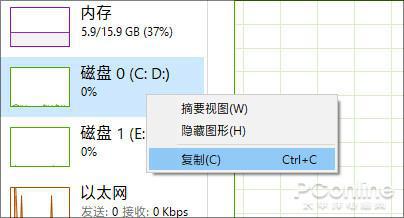 很多小伙伴并不知道,任务管理器里的数值其实是可以复制的。在 " 性能 " 标签下,将鼠标悬停于某个参数之上,右键选择 " 复制 ",这时系统就会将当前指标的参数值自动复制到剪贴板,接下来通过 Ctrl+V 粘贴到所需的区域,就能快速得到当前的系统参数了。