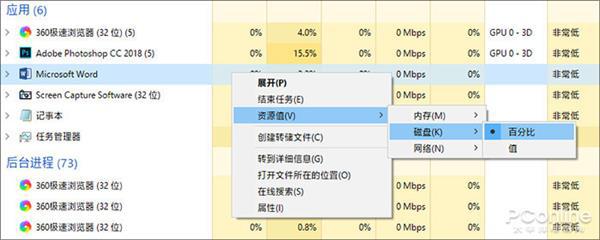 通常我们见到的进程标签,都是按照项目展示,比如 CPU 默认会显示百分数、内存默认会显示资源值、磁盘占用默认会显示速率等等。但其实如果你将鼠标放置在上面点击右键,就能随意控制每个模块的显示方式,比如百分比还是数值。