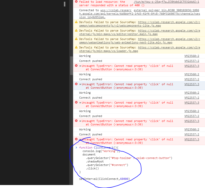 Google colab 可以免费使用GPU、TPU等计算资源进行人工智能计算,但计算页面隔一段时间无操作之后就会自动掉线,之前训练的数据都会丢失,最后终于找到了一种可以让其自动保持不离线的方法,用一个js程序自动点击连接按钮。代码如下: