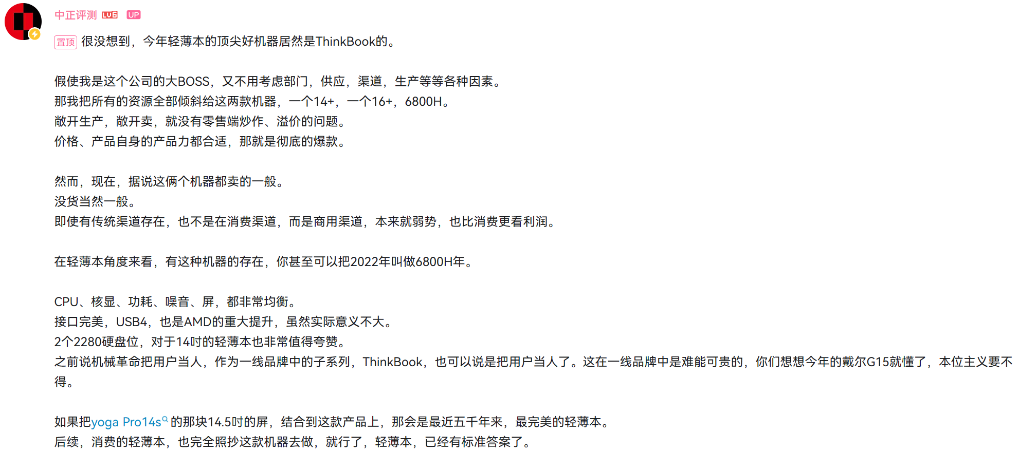 中正评测(我喜欢的UP主)评论及链接附上:中正评测:5299元,ThinkBook14+,R7-6800H笔记本开箱_哔哩哔哩_bilibili