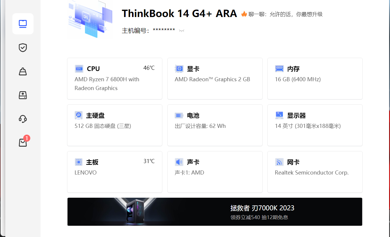 23年1月初新购入联想thinkbook14+R7-6800H,用于移动办公和写程序。挑了挺久,综合考虑还是买下了所长高评的这款,虽然网上很多人说这款品控不怎么样(抱着抽奖的心态,反正京东未激活也能退换)。手气感觉还不错,22年11月份生产,三星硬盘,海力士CPU,螃蟹网卡(这款锐龙版应该都是螃蟹网卡)具体配置如下图。