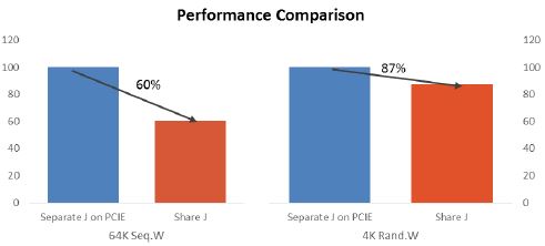 而Journal 和 OSD 使用的 SSD 分开与两者使用同一块SSD,还可以提高性能。下图中,两者放在同一个 SATA SSD 上,性能比分开两块 SSD (Journal 使用 PCIe SSD,OSD 使用 SATA SSD),64K 顺序写速度下降了 40%,而 4K 随机写速度下降了 13%。