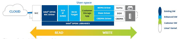 Intel 使用该技术,在用户空间(user space)实现了全 DPDK 网卡及驱动、TCP/IP协议栈(UNS)、 iSCSI Target,以及 NVMe 驱动,来提高Ceph的 iSCSI 访问性能。好处: