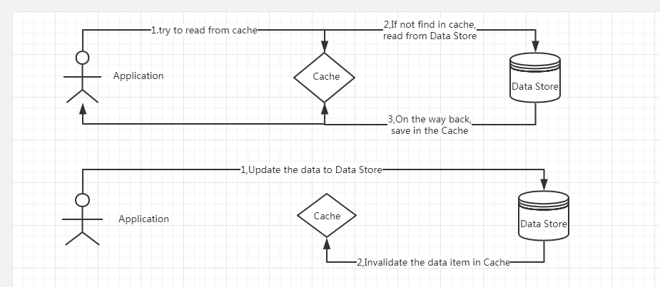 - 失效:应用程序先从cache取数据,没有得到,则从数据库中取数据,成功后,放到缓存中。