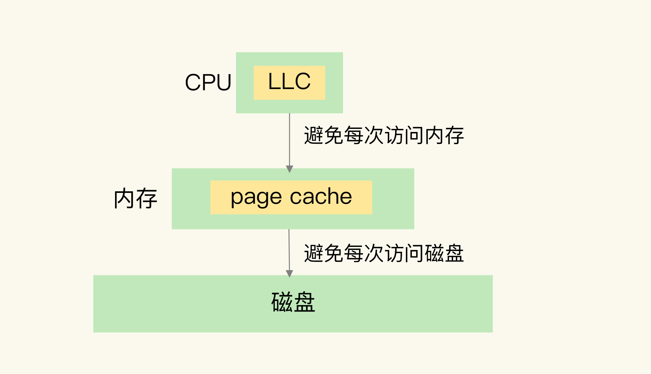从图上可以看到,CPU、内存和磁盘这三层的访问速度从几十ns到100ns,再到几ms,性能的差异很大。