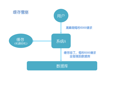 对于系统 A,假设每天高峰期每秒 5000 个请求,本来缓存在高峰期可以扛住每秒 4000 个请求,但是缓存机器意外发生了全盘宕机。缓存挂了,此时 1 秒 5000 个请求全部落数据库,数据库必然扛不住,它会报一下警,然后就挂了。此时,如果没有采用什么特别的方案来处理这个故障,DBA 很着急,重启数据库,但是数据库立马又被新的流量给打死了。 解决办法:
