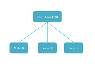 Hash分片算法就是我们拿到缓存的key,然后对其做hash运算,最后将hash运算的结果对缓存总节点数取余,得到的数字则为具体的分片节点。比如,现在我们缓存节点一共有 3 个,当我们写入数据的时候,将key进行hash运算hash(key),然后将结果对3取余就行了,如下图所示:
