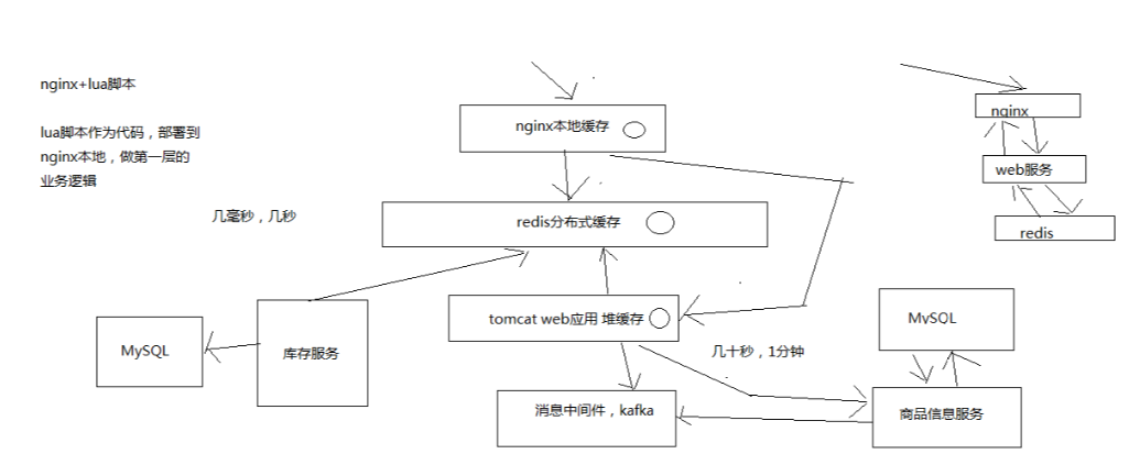 nginx+lua 脚本做页面动态生成的工作,每次请求过来,优先从 nginx 本地缓存中提取各种数据,结合页面模板,生成需要的页面,如果 nginx 本地缓存过期了,那么就从 nginx 到 redis 中去拉取数据,更新到 nginx 本地,如果 redis 中也被 LRU 算法清理掉了,那么就从 nginx走 http 接口到后端的服务中拉取数据,数据生产服务中,现在本地 tomcat 里的 jvm 堆缓存(ehcache)中找,如果也被 LRU 清理掉了,那么就重新发送请求到源头的服务中去拉取数据,然后再次更新 tomcat 堆内存缓存 + redis 缓存,并返回数据给 nginx,nginx 缓存到本地