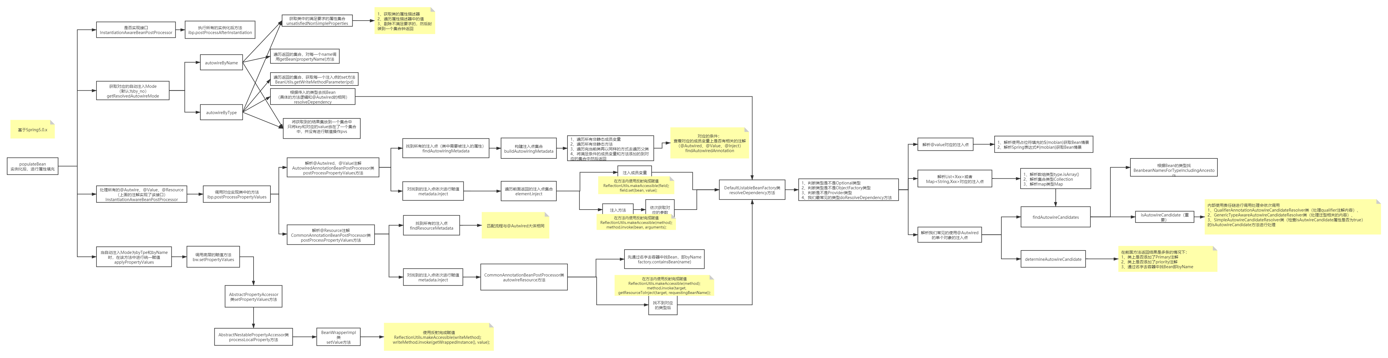 主要讲解 Spring 生命周期中实例化后的方法。方法入口为 populateBean(beanName, mbd, instanceWrapper),该方法除了调用 InstantiationAwareBeanPostProcessor 接口的 postProcessAfterInstantiation 方法(实例化后的扩展接口),还会进行属性的依赖注入,即给 Bean 中符合要求的字段进行属性填充。