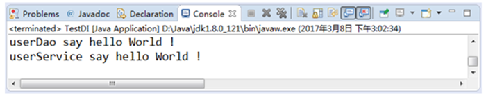 从上图可以看出使用Spring容器通过UserService实现类中的say()方法,调用了UserDao实现类中的say()方法并输出了结果。这就是Spring容器属性setter注入的方式也是实际开发中最为常用的一种方式。