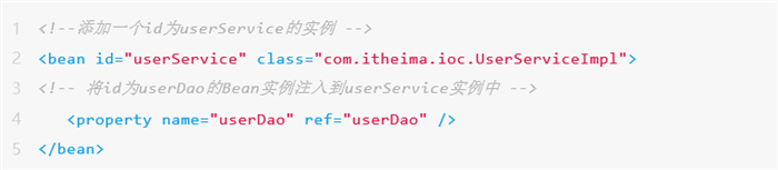 3、在配置文件applicationContext.xml中创建一个id为userService的Bean,该Bean用于实例化UserServiceImpl类的信息并将userDao的实例注入到userService中,其代码如下: