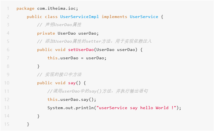 2、在com.itheima.ioc包中创建UserService接口的实现类UserServiceImpl,在类中声明userDao属性,并添加属性的setter方法: