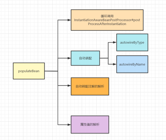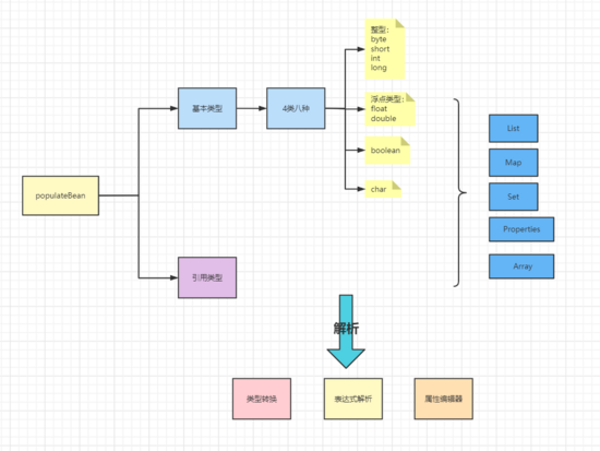 属性填充大致可以分为对基本类型的数据进行填充和对应用类型的数据填充, populateBean 方法中代码比较繁琐,会设计到很多的递归调用,最终解析并填充属性。