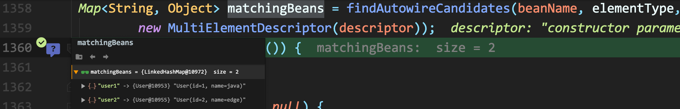 Map<String, Object> matchingBeans = findAutowireCandidates(beanName, elementType,