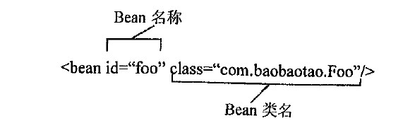 一般情况下,Spring IOC容器中的一个Bean即对应配置文件中的一个<bean>,这种镜像对应关系应该容易理解。其中id为这个Bean的名称,通过容器的getBean("foo")即可获取对应的Bean,在容器中起到定位查找的作用,是外部程序和Spring IOC容器进行交互的桥梁。class属性指定了Bean对应的实现类。