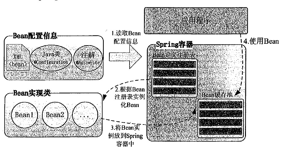Bean配置信息定义了Bean的实现及依赖关系,Spring容器根据各种形式的Bean配置信息在容器内部建立Bean定义注册表,然后根据注册表加载、实例化Bean,并建立Bean和Bean的依赖关系,最后将这些准备就绪的Bean放到Bean缓存池中,以供外层的应用程序进行调用。