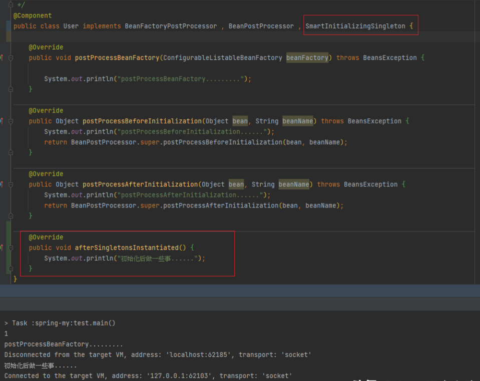 其中有个插曲是否实现了SmartInitializingSingleton接口,将接口让你可以在bean初始化后做一些事,我们写一个简单的实例测试一下。