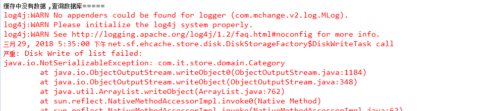 今天使用Ehcache进行数据缓存时,出现了java.io.NotSerializableException: com.it.store.domain.Category的错误,如下图: