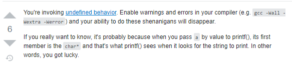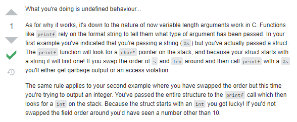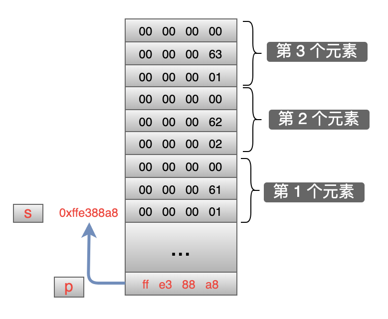 既然 s 也是一个地址,它也代表了这个数组中第一个元素的首地址。第一个元素类型是结构体,结构体中第一个变量是 int 型,因此 s 所代表的那个位置是一个 int 型数据,对应到示例代码中就是数字 1。因此 printf 语句中希望直接把这个地址处的数据当做一个 int 型数据打印出来,期望的打印结果是:1, 1。