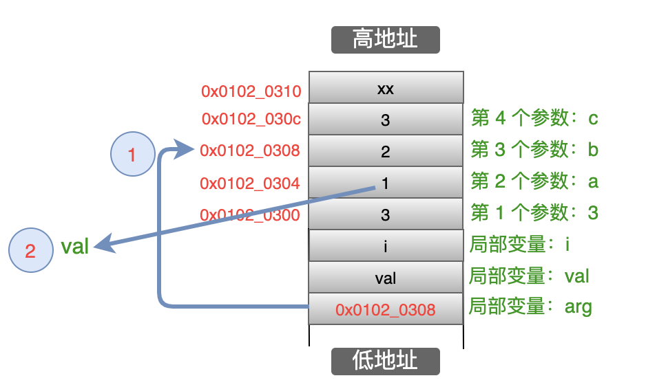 结合下面的图来分析一下:先把 arg 自增 int 型数据的大小(4个字节),使得 arg = 0x01020308;然后再把这个地址(0x01020308)减去4个字节,得到的地址(0x01020304)里的这个值,强转成 int 型,赋值给 val,如下图所示: