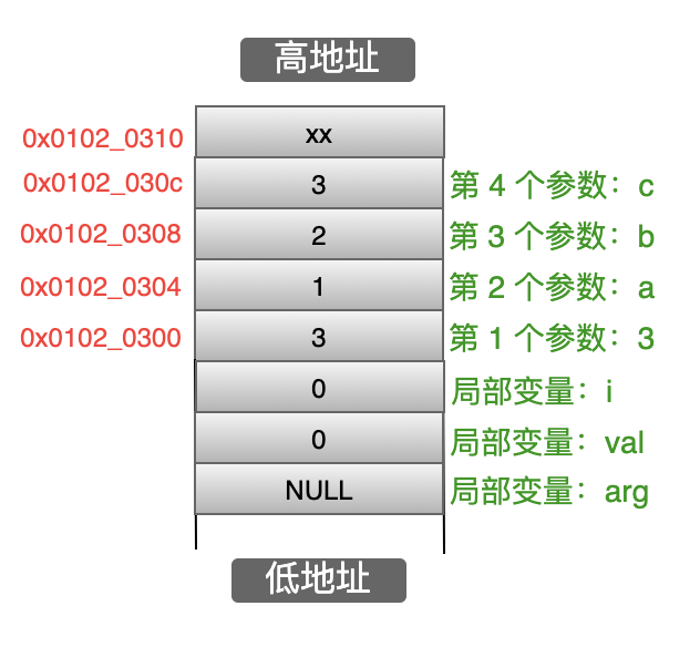 这就好理解了,直接把指针 arg 设置为空。因为栈中的所有动态参数被提取后,arg 的值为 0x01020310(最后一个参数的上一个地址),如果不设置为 NULL 的话,下面使用的话就得到未知的结果,为了防止误操作,需要设置为NULL。