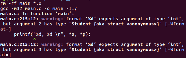 警告信息说:printf 语句需要 int 型数据,但是传递了一个 Student 结构体类型,我们先不用理会这个警告,因为我们就是想通过指针来访问这个地址里的数据。