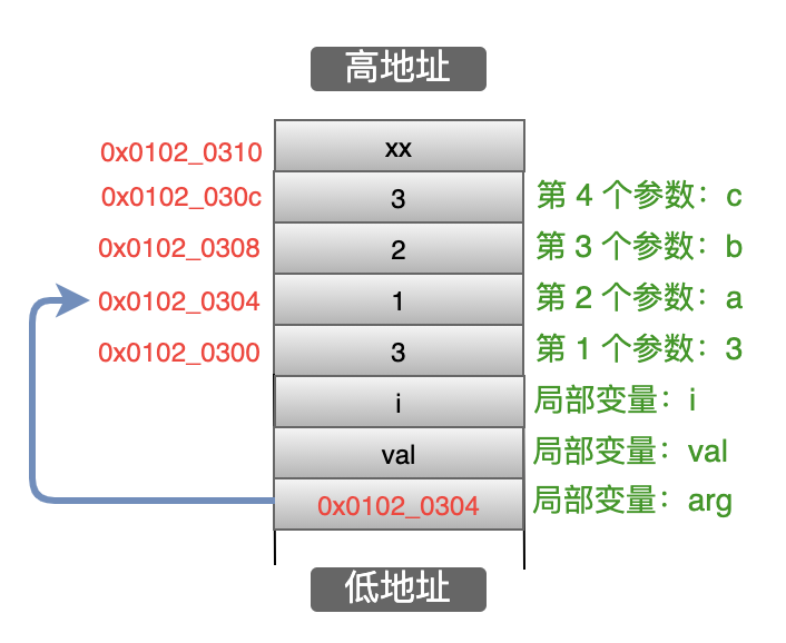 结合下面的图来分析一下:首先通过 _ADDRESSOF 得到 num 的地址 0x01020300,然后强转成 char* 类型,再然后加上 num 占据的字节数(4个字节),得到地址 0x01020304,最后把这个地址赋值给 arg,因此 arg 这个指针就指向了栈中数字 1 的那个地址,也就是第一个参数,如下图所示: