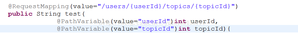 如请求的URL为“控制器URL/users/123/topics/456”,则自动将URL中模板变量{userId}和{topicId}绑定到通过@PathVariable注解的同名参数上,入参后userId=123、topicId=456。