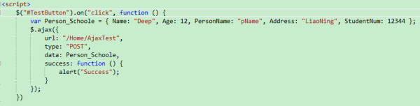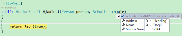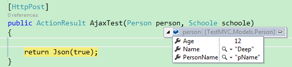 所以在ajax的data中,需要定义一个包含上边两个class的所有属性的对象,这里需要注意,后台的两个类最好不要有同名的属性,如果有同名的属性,但需要的是不同值,前台这块就不能处理了(上边的两个类都有Name属性,所以都controller中时,都被绑定为”Deep“了)