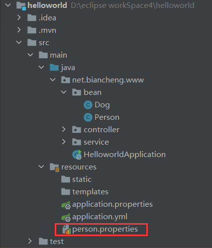 1. 以 helloworld 为例,将与 person 相关的自定义配置移动到 src/main/resources 下的 person.properties 中(注意,必须把 application.properties 或 application.yml 中的相关配置删除),如下图。