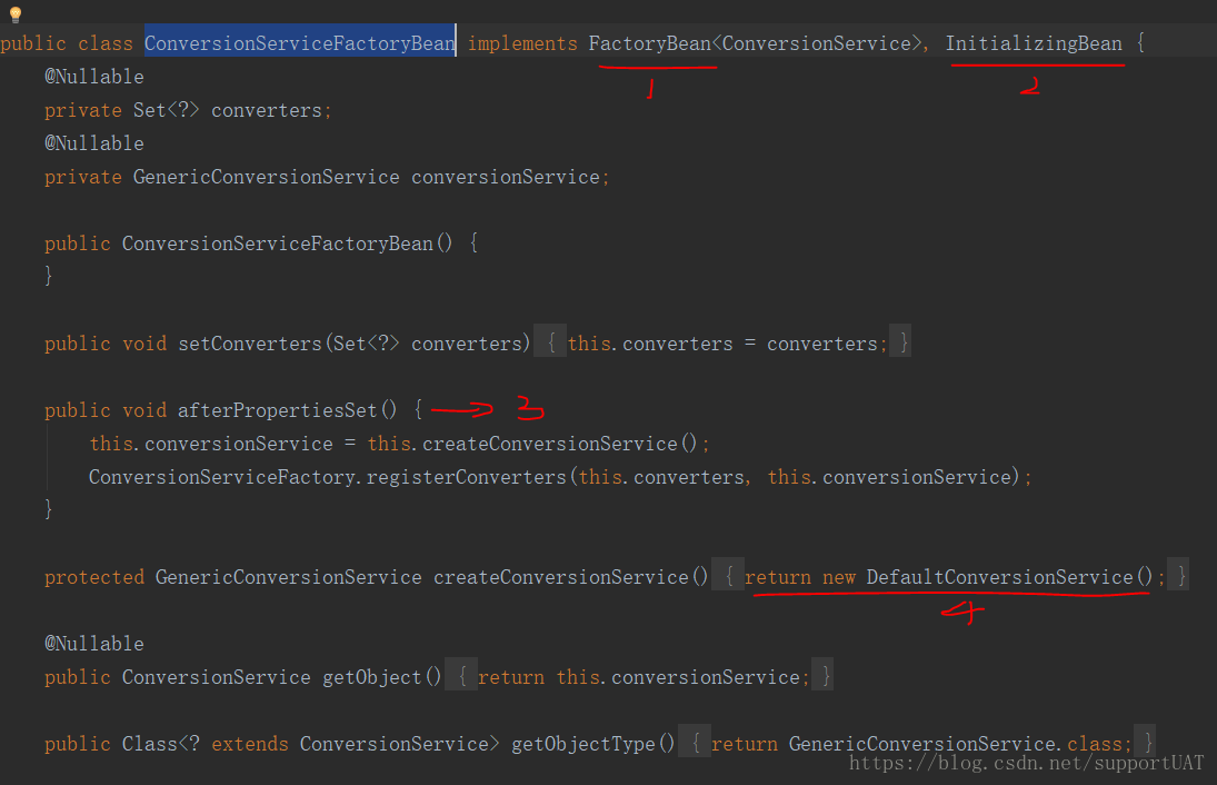 3、ConversionServiceFactoryBean实现了factoryBean和InitializingBean,在IOC创建Bean的过程中将调用afterPropertiesSet()创建GenericConversionService(默认创建DefaultConversionService)