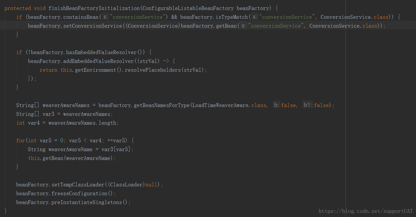 2、容器初始化完成后调用AbstractApplicationContext.finishBeanFactoryInitialization()方法,将ID为conversionService