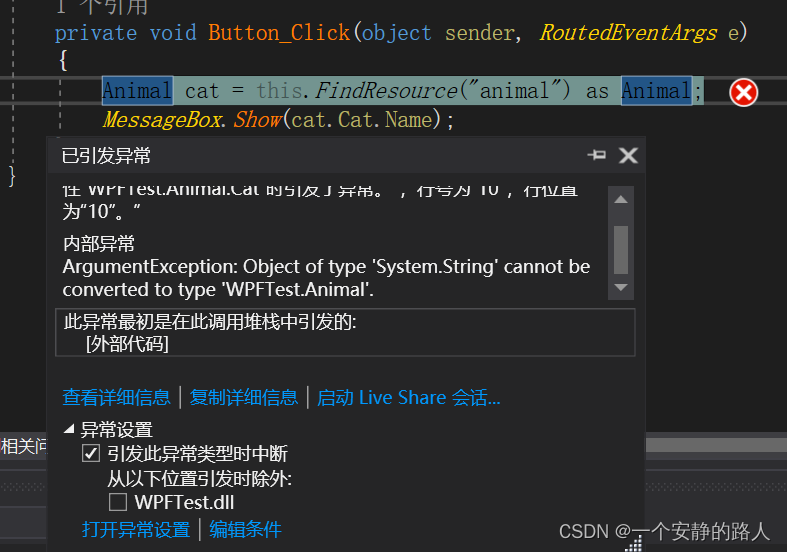 运行后,点击按钮发现爆出异常,这是因为xaml中的“cat”字符串无法转换成Animal类型。