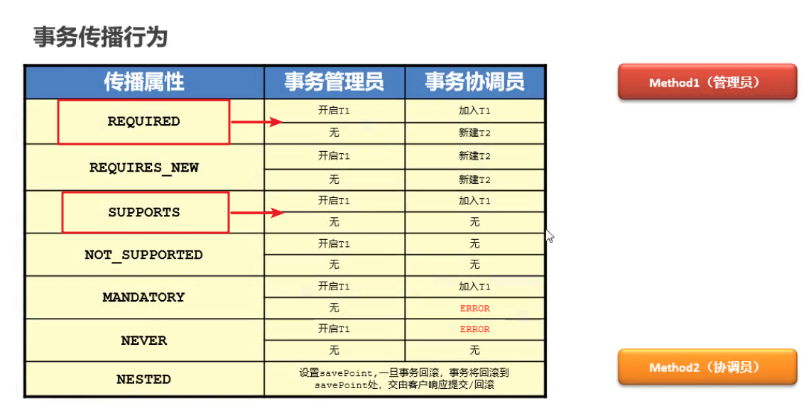 ⑦ PROPAGATION_NESTED:如果当前存在事务,则在嵌套事务内执行。如果当前没有事务,则按REQUIRED属性执行。