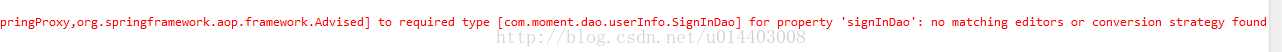 org.springframework.beans.factory.BeanCreationException: Error creating bean with name 'signInService' defined in ServletContext resource [/WEB-INF/applicationContext-beans.xml]: Initialization of bean failed; nested exception is org.springframework.beans.ConversionNotSupportedException: Failed to convert property value of type 'com.sun.proxy.$Proxy55 implementing com.moment.dao.userInfo.SignInDaoImpl,org.springframework.aop.SpringProxy,org.springframework.aop.framework.Advised' to required type 'com.moment.dao.userInfo.SignInDao' for property 'signInDao'; nested exception is java.lang.IllegalStateException: Cannot convert value of type [com.sun.proxy.$Proxy55 implementing com.moment.dao.userInfo.SignInDaoImpl,org.springframework.aop.SpringProxy,org.springframework.aop.framework.Advised] to required type [com.moment.dao.userInfo.SignInDao] for property 'signInDao': no matching editors or conversion strategy found