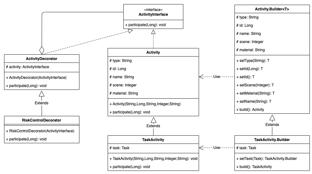 小明发现,上面的建造器没有使用诸如抽象建造器类等完整的实现,但是基本是完成了活动各个组件的建造流程。使用建造器的模式下,可以先按顺序构建字段type,然后依次构建其他组件,最后使用build方法获取建造完成的活动。这种设计一方面封装性好,构建和表示分离;另一方面扩展性好,各个具体的建造者相互独立,有利于系统的解耦。可以说是一次比较有价值的重构。在实际的应用中,如果字段类型多,同时各个字段只需要简单的赋值,可以直接引用Lombok的@Builder注解来实现轻量的建造者。