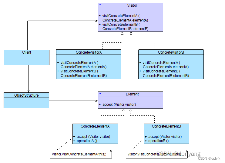 - 对象结构中对象对应的类很少改变,但经常需要在此对象结构上定义新的操作