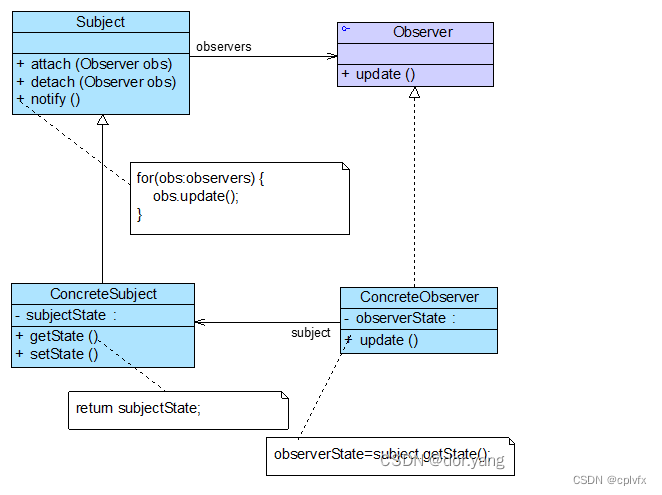 - 但是整体是符合开闭原则的。增加新的具体观察者无须修改原有系统代码,在具体观察者与观察目标之间不存在关联关系的情况下,增加新的观察目标也很方便
