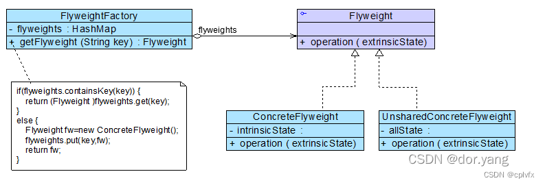 - 享元池(Flyweight Pool):存储共享实例对象的地方
