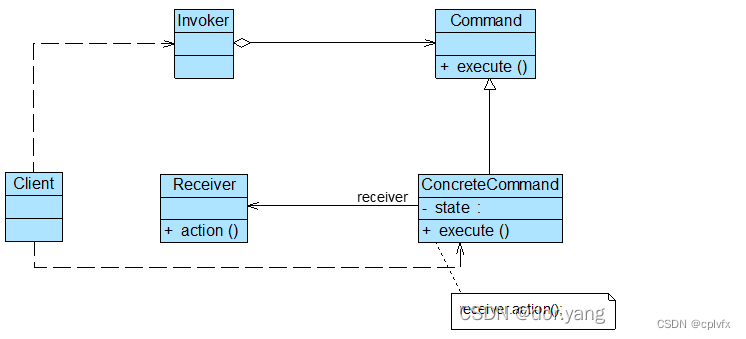 - 有一个小套娃,invoker有command,可以调用execute,实现receiver的action